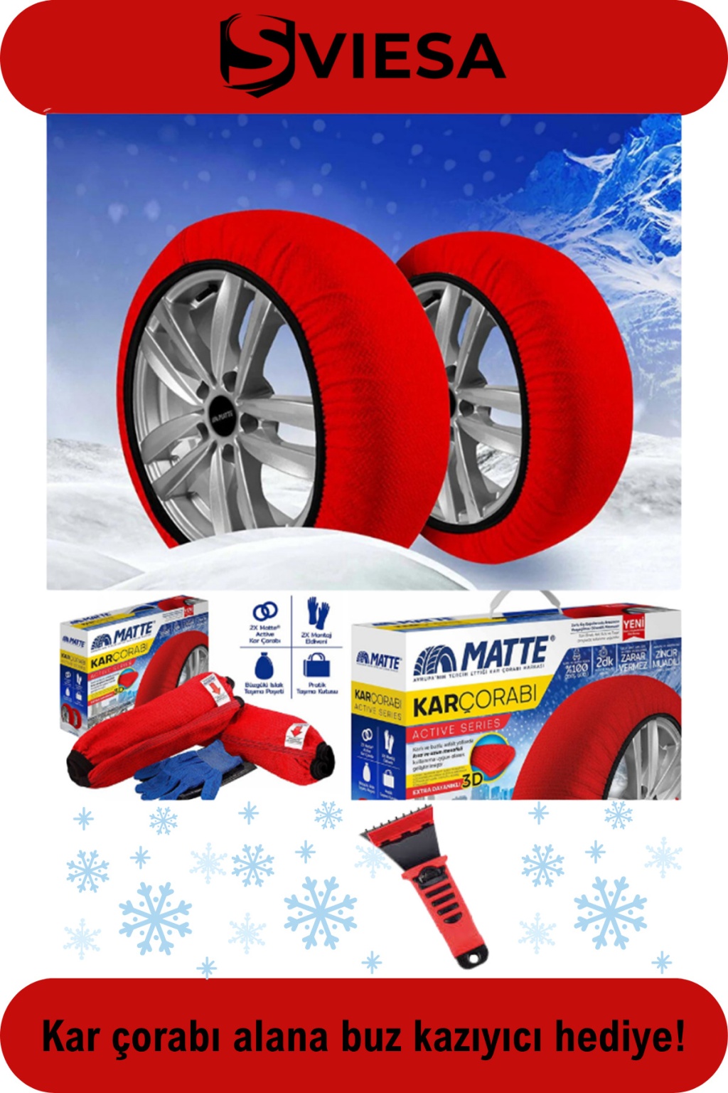 Karlı ve Buzlu yol koşullarında eşsiz yol tutuşu ve direksiyon hakimiyeti sağlayan Matte Kar Patinaj Çorapları, yola tutunma özelliği ve dayanıklılığı son derece yüksek ileri teknoloji tekstil ürünlerinden imal edilmiştir MATTE KAR ÇORABI ACTIVE SERIES sizlerle.; ✅Zorlu kış koşullarında aracınız için yol tutuşu sağlar.; ✅Kar Zincirine kıyasla takılması çok kolay ve zahmetsizdir.; ✅Trafikte Geçiş İzni verilmektedir, Zincir Muadili olarak kabul edilir.; ✅Zincire kıyasla aracınıza, lastiğinize, jantınıza zarar vermez, hırpalamaz.; ✅ Uzun ömürlüdür, çok sefer kullanım olanağı sağlar.;